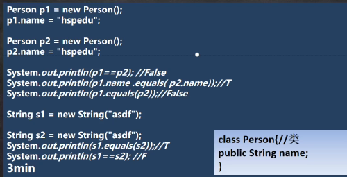 第三个F中,Person没有重写equals方法,因此它们可以看做是p1==p2,也就是地址比较,很显然不同。