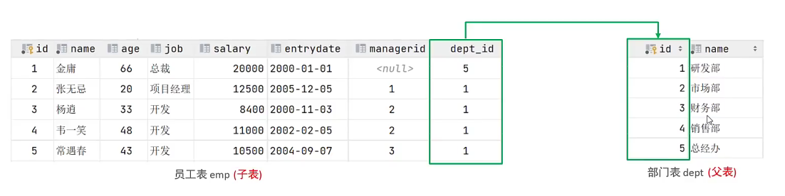 概念:外键用来让两张表的数据之间建立连接,从而保证数据的一致性和完整性。